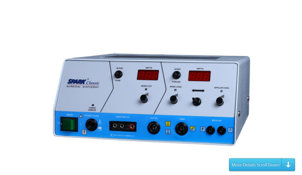 The true value cautery. This is a digital underwater cutting surgical diathermy that can be used for TURP,Laparoscopy & general surgical procedures. Standard features include handswitch & silicone rubberpatient plate. A dedicated TURP socket ensures better loop life & smooth output for underwater cuttingapplications. The spray mode in monopolar coag gives an added advantage. This unit delivers superiorcoagulation thanks to its special design.